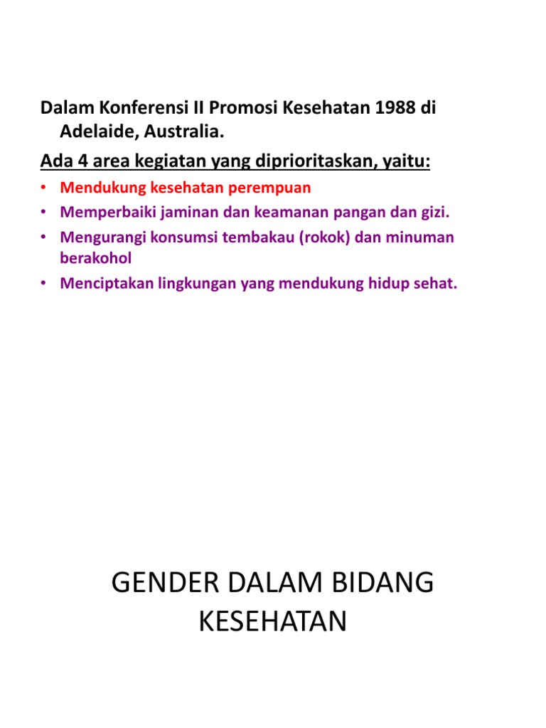 ANALISIS GENDER GENDER DAN KESEHATAN Aspek Kesehatan. Kesetaraan dan Keadilan Gender KKG sudah menjadi komitmen bangsa-bangsa di dunia yang dipertegas dalam Deklarasi Global Konferensi Perempuan Sedunia ke-IV tahun. Berdasarkan penjelasan di atas maka dapat disimpulkan bahwa gender adalah fisik antara laki-laki dan perempuanuntuk memisahkan pencirian manusia dalam hal peran.